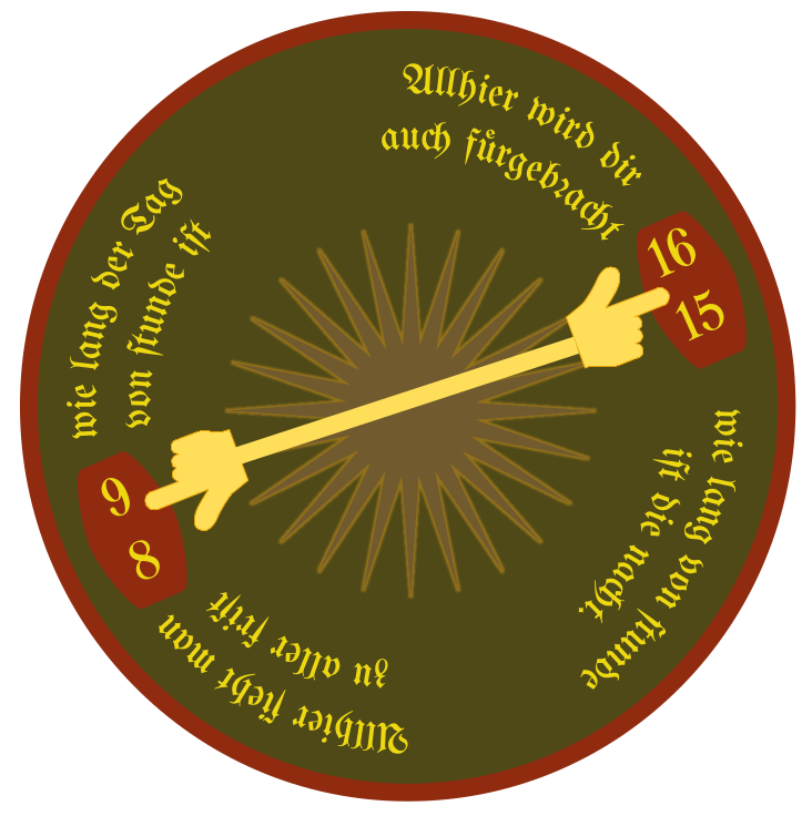 Der Stundenzeiger ist ein Doppelzeiger, am einen Ende trägt er eine Hand, am anderen einen Stern. Die Hand zeigt die gültige Stunde an – am Tag in der oberen Hälfte des Rings, nachts in der untere Hälfte. Einen Minutenzeiger gibt es nicht. Im Bild zeigt die Stellung des Stundenzeigers eine Zeit von ca. halb zwölf am Tage an; tatsächlich war es 11:37 Uhr.