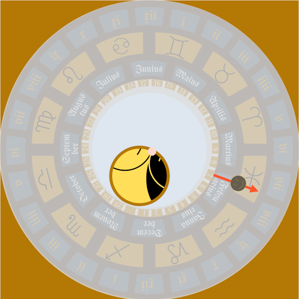 Auf der Mondscheibe sind ein Vollmond und ein Neumond aufgemalt, von denen je nach Mondphase ein Ausschnitt im Loch der Sonnenscheibe erscheint. Bei Vollmond sehen wir das helle Vollmondgesicht, bei Neumond das dunkle Neumondgesicht. Im Beispiel sind beide Mondgesichter fast gleich groß, der von links ins Loch kommende helle Mond ist nur wenig kleiner als der nach rechts verschwindende dunkle Teil, der Unterschied ist kaum wahrzunehmen. Tatsächlich war es einen Tag vor dem zunehmenden Halbmond, 7 Tage nach dem Neumond. Das zeigt mir der Kalender, in dem die Mondphasen eingetragen sind, aber auch der Ring mit den Zahlen von 1 bis 29 am Außenrand der Sonnenscheibe. Diese Zahlen geben das so genannte Mondalter an, gerechnet in Tagen von Neumond an. Der Mondzeiger steht in diesem wie zu erwarten unter der 7. Auch der Mondzeiger durchläuft die Tierkreiszeichen, am 27. November 2025 steht er im Zeichen der Fische.